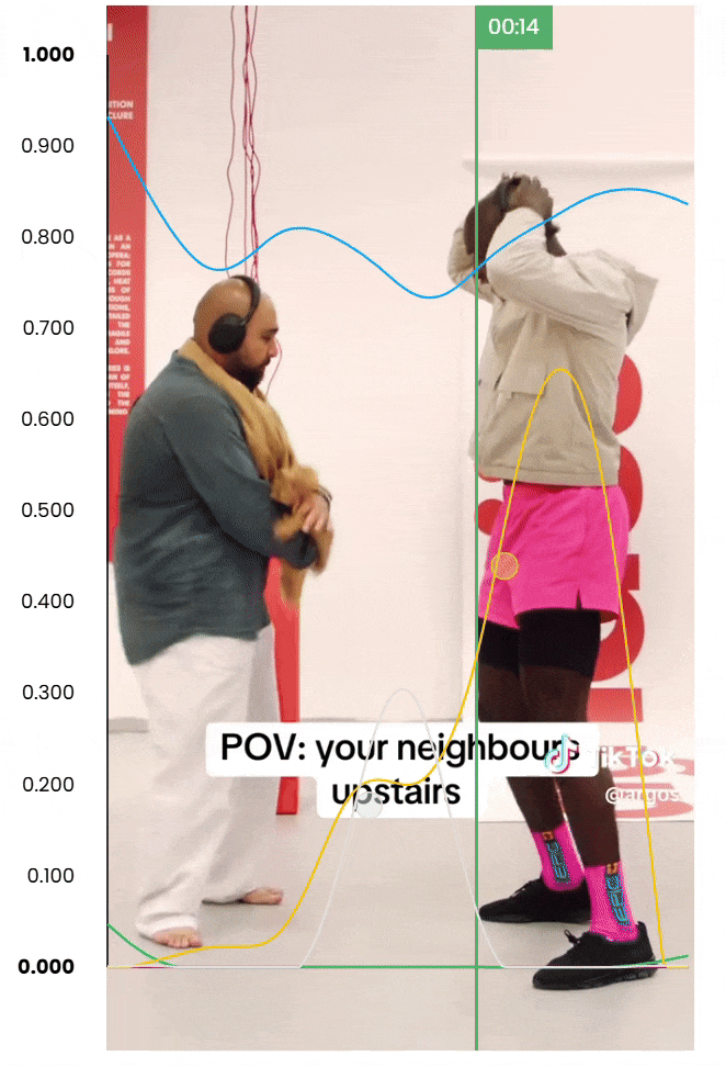 The comedic power of Asim’s content was on full display with our Attention & Emotion measurement. In one clip Asim grooves with fitness influencer Paul Olima, causing huge spikes in Happiness (yellow line) and Surprise (white).
