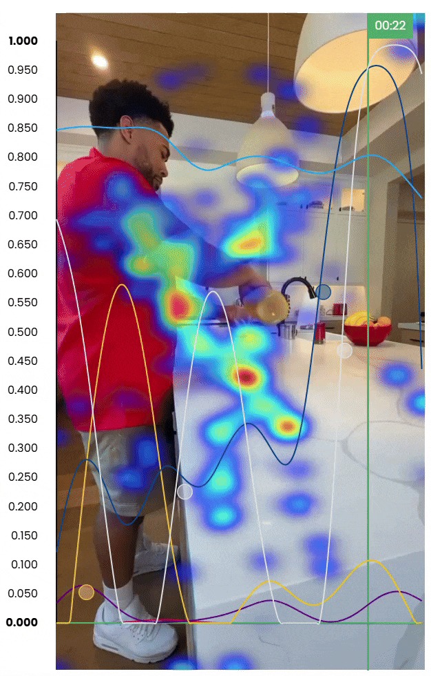 With Daniel Labelle, we saw huge spikes in Happiness (Yellow curve) and Surprise (White), as Daniel and Jake romped about the house and neighborhood, bailing each other out of increasingly silly scenarios. That “blue” emotion curve is actually Sadness — we often see a Sadness or Fear spike at nerve-wracking moments, which is again a positive sign that the audience is engaged in the story.