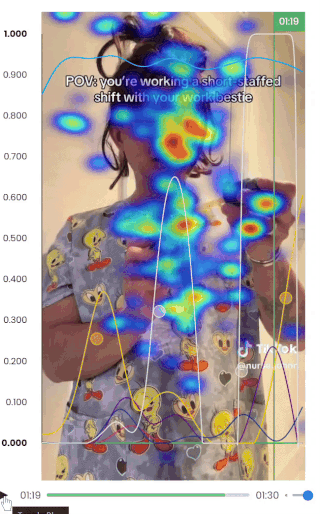 Element Human’s Stopping & Staying Power framework measures how well a creator’s content gets attention in the social feed (Stopping Power) and creates long term memory associations for the brand (Staying Power). As you can see, the results were mixed. Nurse.Johnn was clearly the more attention-getting, delivering an impressive Top 8% ranking for seconds spent looking in the TikTok feed. Np.Miranda performed below benchmark, ranking in the 41st percentile. However the story was the opposite when it came to Staying Power. Whilst neither knocked it out of the park, Miranda was above benchmark, with a Staying Power score in the Top 35% for TikTok.